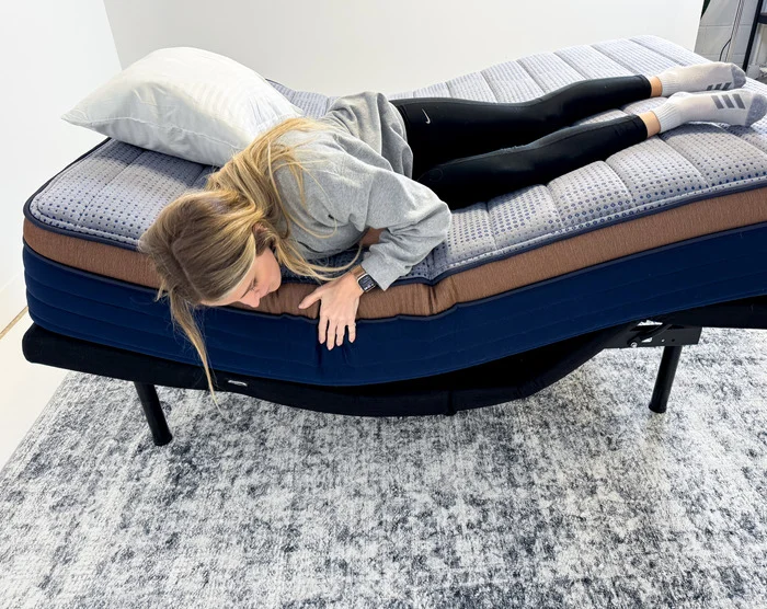 A tester examines the gap between a mattress and the adjustable base below.