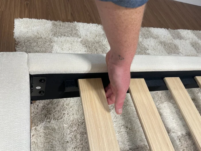 During assembly, I noticed that the materials used in this frameโs construction were high-quality and comfortable. The upholstery feels soft to the touch, and the wooden bits of the frame look and feel rigid. The slats in the center are thick, evenly spaced, and unlikely to shift around when bearing the weight of your mattress. I rated the materials at a 4.5/5, as I expect this bed frame to last a long time.