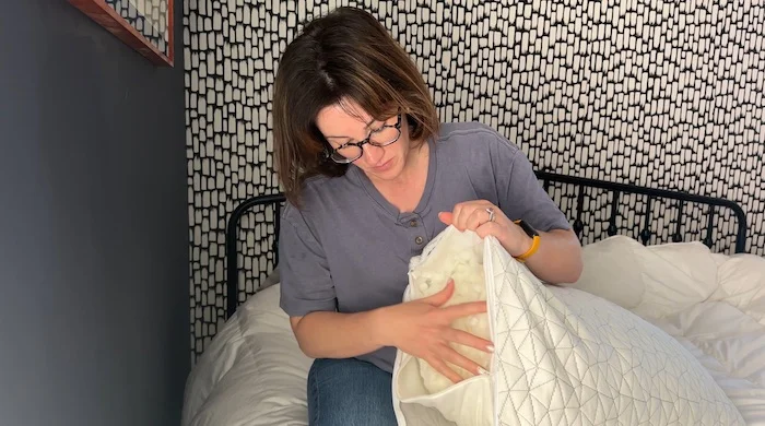 Even though neither she or her husband are stomach sleepers, Sosha zipped the pillow all the way up to try it on her stomach. She thought it would be a great fit for this sleeper type, even if she didnโt like this setting on her back or side. She did note it was a bit heavy, so if you plan on moving your pillow around a lot at night, it might be difficult to do so.