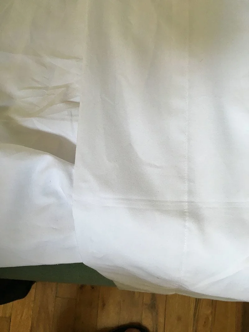 The sheets are a percale weave, which means they have a crispy feeling, rather than a silky-smooth feeling. Compared to other percale options that I have tried, they actually felt smoother and softer out of the box and became slightly softer after a few washes – definitely less crispy than Brooklinen or Parachute. The sheets fit my queen size well, I didn’t notice any shrinkage after washing; one place to look at fit for me is always the pillowcases, and I think Authenticity 50 did a good job with sizing. In the photo below, one can see it fits my slightly-smaller-than-average pillow well and has some space for a larger pillow also.