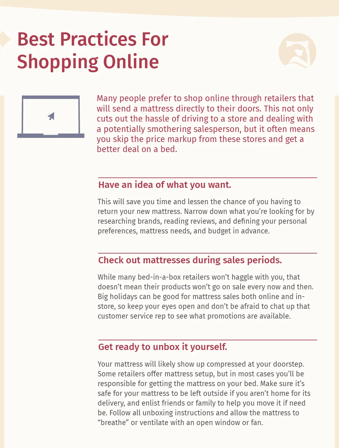 When to Buy a New Mattress | What to Look for | Mattress Sizes | Mattresses Types | Mattress Tops | Sleep Position| Specific Sleep Needs | Mattress Support | In-Store Shopping | Online Shopping | Buying a Used Mattress | Mattress Prices | Trial Periods & Warranties | Mattress Delivery | Mattress Protectors | Pillows | Keeping a Mattress Clean | Bottom Line