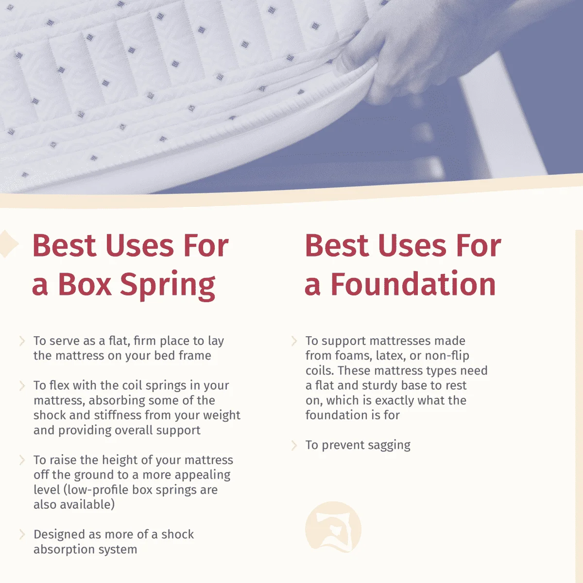 These different types of mattresses may need to be supported in different ways, so always check with the manufacturer to see if a box spring or foundation is required for a particular innerspring bed. (Weโll talk more about box springs and foundations later on in this guide.)