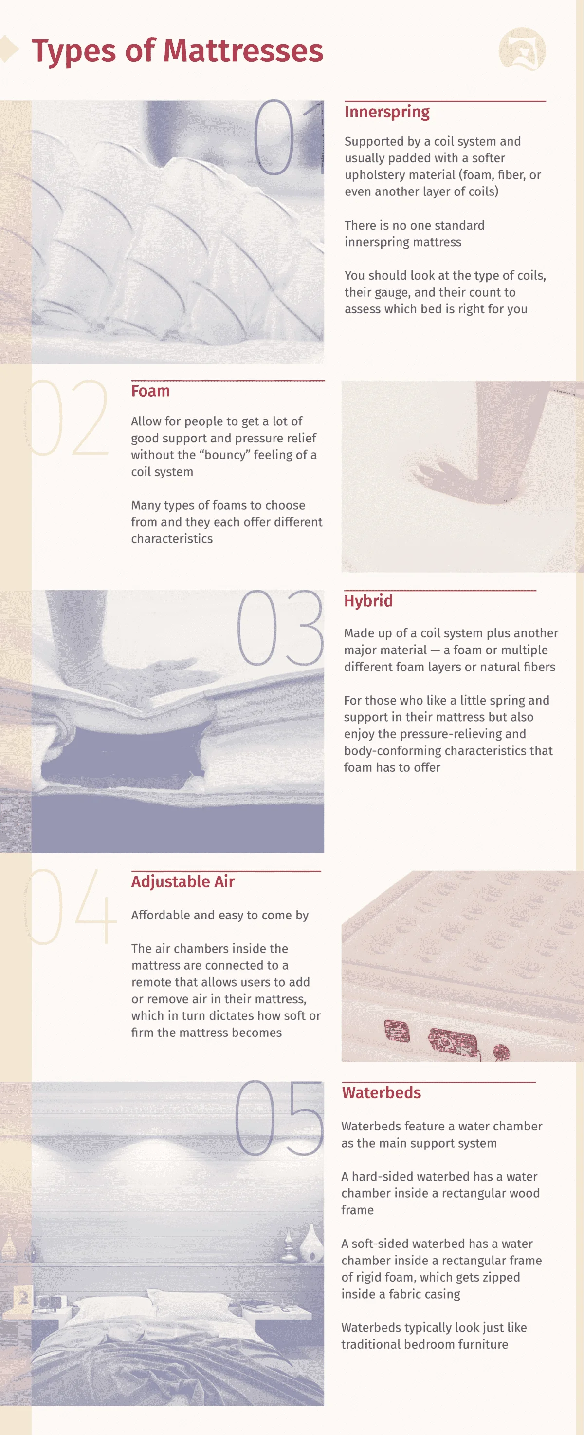 One of the first questions youโll face when deciding on a new mattress is which type of mattress you want to buy. There are more mattress types available than ever before, and they each come with their own pros, cons, and distinct features. Hereโs an overview of the different types of mattresses youโre likely to encounter in your quest for a new sleeping surface.