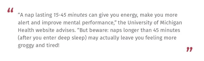 “A nap lasting 15-45 minutes can give you energy, make you more alert and improve mental performance,” the University of Michigan Health website advises. “But beware: naps longer than 45 minutes (after you enter deep sleep) may actually leave you feeling more groggy and tired!”