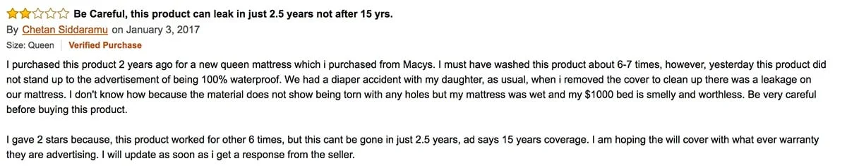 When I checked under the protector (I have a second waterproof protector underneath when I perform waterproof tests) I felt no moisture or dampness. The protector passed the waterproof test for me! There were a few reviews from customers who experienced leaks and water damage to their own mattress. One of the reviewers mentioned that he/she had issues after several years of use.