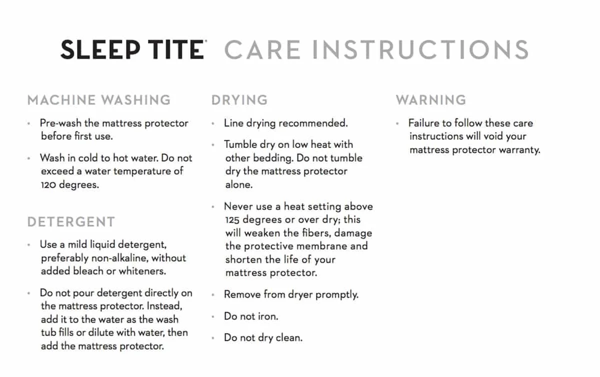 Care instructions can be very specific to the mattress protector, so make sure to read them carefully. Here are the care instructions for the Sleep Tite Pr1me mattress protector: