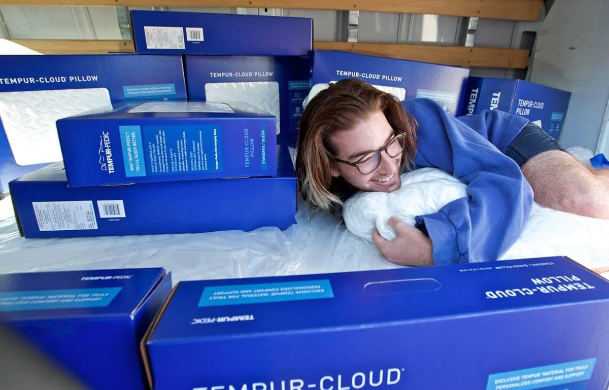 A few months later, Tempur-Pedic representative Rick Maynard showed up at Reed College to surprise Michaels, accompanied by a reporter, camera crew, and a truck full of loot. The company roused the college senior out of bed and presented him with goodies including a brand-new Tempur-Pedic mattress, an adjustable bed base, 25 pillows, embroidered pajamas, and a robe.