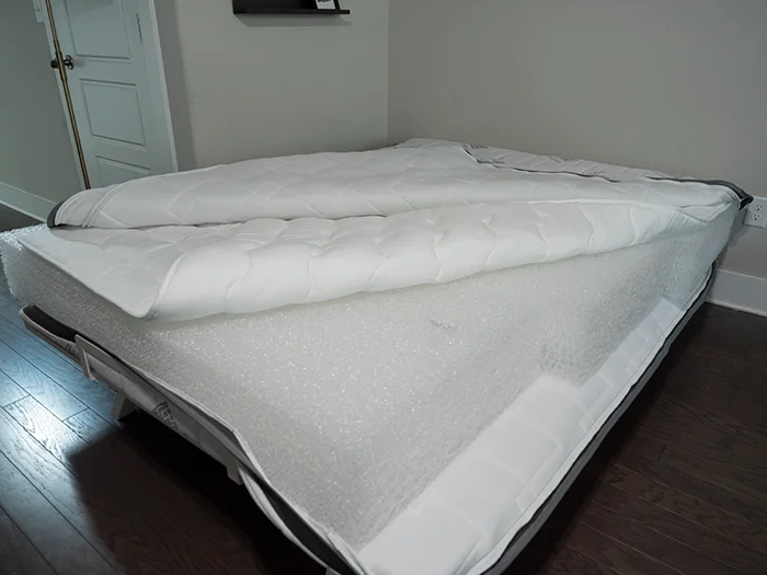What’s cool about this layer is that it is separated into three blocks with a dual mode. Each block can be flipped onto either the more firm or less firm side, creating the dual mode feature of this bed. Because there are three blocks, you can also customize the firmness in different sections of the mattress. For example, you could make it firmer near your head and feet and softer in the middle to help relieve pain.