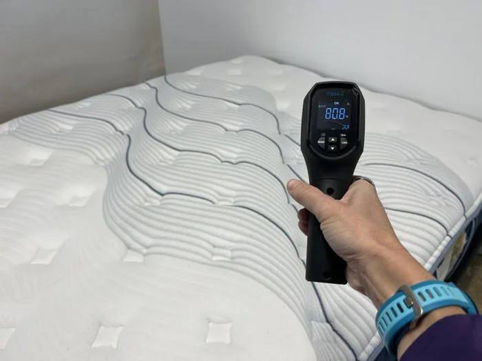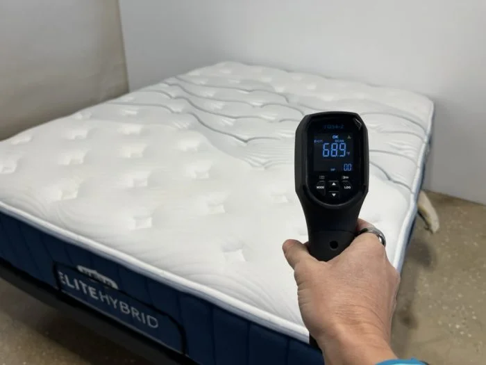 Hot sleepers looking to spend less money on air conditioning might want to look for a cooling mattress. We evaluate a bed’s temperature-regulating ability not only by what’s in it, but how it performs in our cooling test. In this test, we use a thermal gun to measure the surface temperature of the bed. First, we take the temperature before anyone lies down on it, then again after we’ve had a quick rest on the bed for about seven minutes. From here, we’ll take a look at the overall increase and use that to calculate our final score.