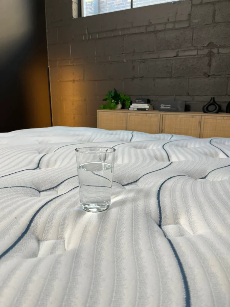 We test motion isolation in two ways: First, we place a glass of water on one side of the bed, and then move around on the other. We get in and out of bed, switch positions, roll around, etc. However much the water ripples or the glass wobbles reveals how much motion is traveling across the surface. Cait, who performed this test, said, “There were some small ripples in the water when I got in and out of bed, but not enough to make the cup teeter or the water slosh.” This is a sign of overall low motion transfer.