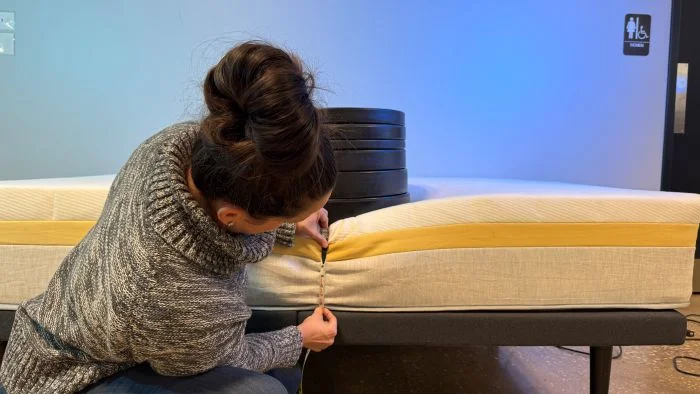 To measure how firm a mattress is, we invite testers of different shapes, sizes, and sleep preferences to lie on the mattress in various positions and provide feedback on how soft (or rigid) it feels. They also note how far they sink into the bed around high-pressure areas, such as the hips, shoulders, and lower back.