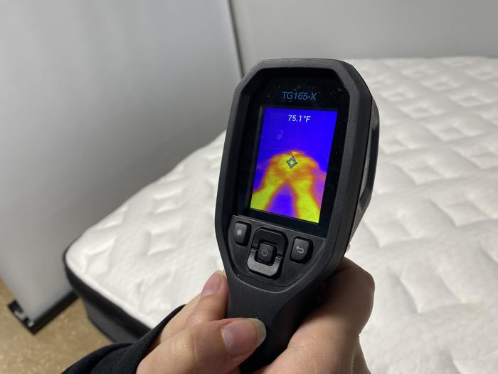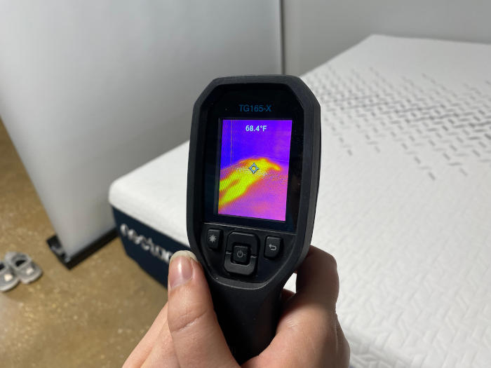 Research shows that a cool sleeping environment helps people fall asleep faster and improves sleep quality. To assess cooling, our testers feel the surface of a mattress to see if it has a cool-to-the-touch cover. Next, we use a thermal gun to take the initial surface temperature of the mattress. Finally, we lie on the mattress for seven minutes, noting if we feel the bed heating up beneath us. After seven minutes of uninterrupted rest, we take the surface temperature again.