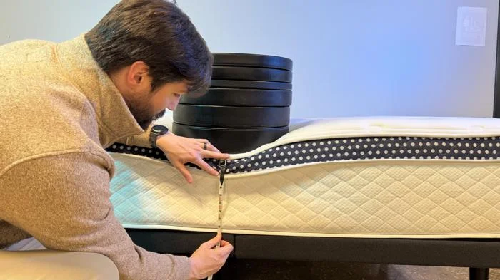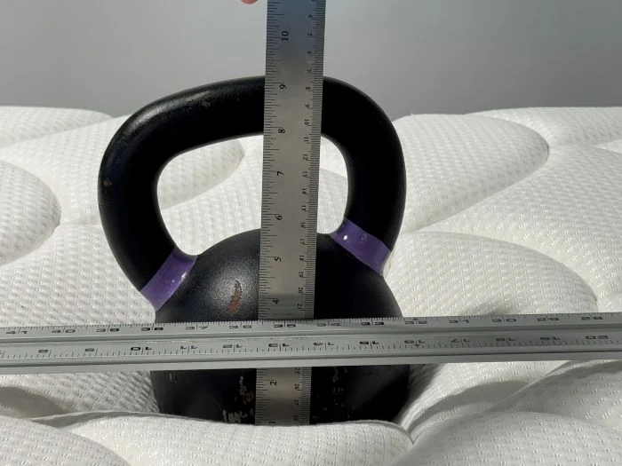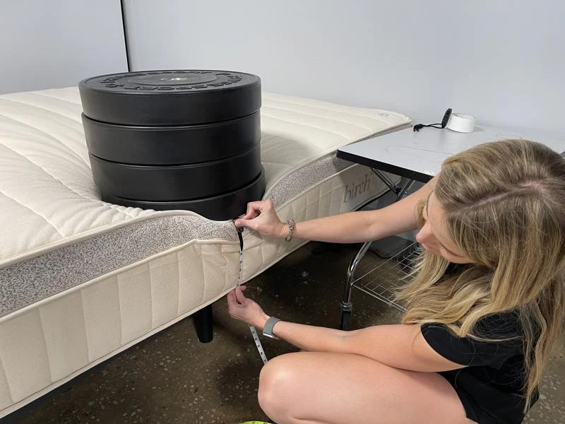 The second edge support test is the weighted edge support test. In this test, we stack weight plates on the edge of the mattress, with different amounts representing each body weight category (lightweight, average-weight, and heavyweight). We then use a tape measure to record the sinkage depth for each and rate our findings out of five. More sinkage will result in a lower score. The overall edge support score is the average of the test above and the weighted edge support test.