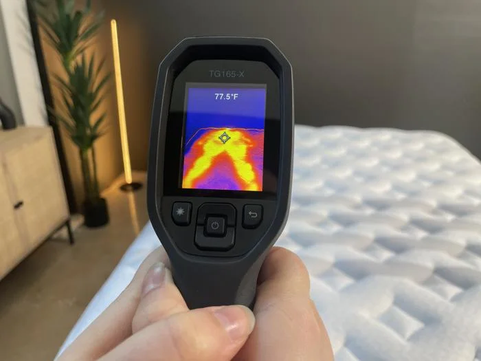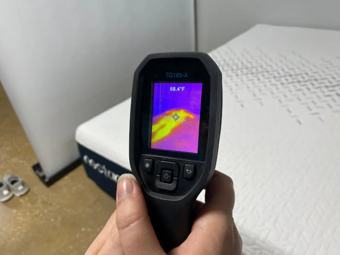 To ensure a mattress lives up to the hype, we perform a cooling test using a thermal gun. We record the mattressโs surface temperature before and after one of our testers takes a seven-minute nap, and the increase directly correlates with how much heat the bed retains (or dissipates). Our testers will also give their opinion on how cool the mattress felt lying there, and whether their findings contradict the results of our thermal gun test.