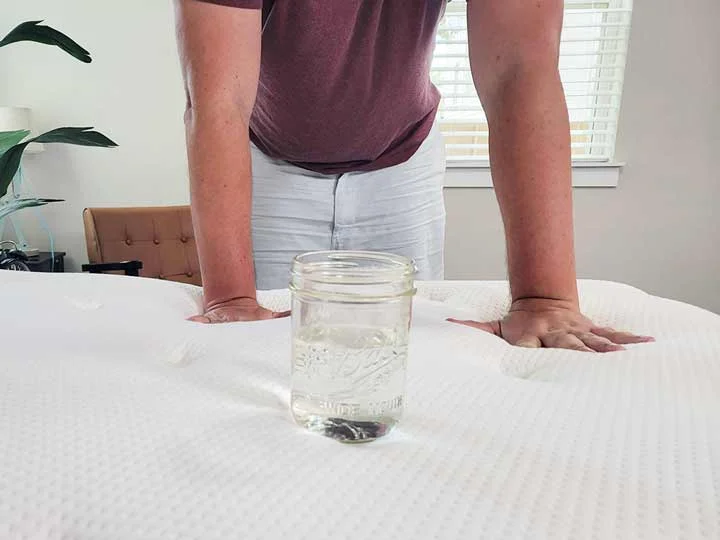 We test for motion transfer to determine how well the mattress absorbs movement and prevents it from moving across the bed. This is especially important for couples or light sleepers. One way we test this is by placing a glass of water on one side of the bed while the tester rolls and shifts positions on the opposite side. We observe whether the water spills or stays still, helping us gauge how well the mattress limits disturbances from movement. A mattress with good motion isolation will help both sleepers rest undisturbed, even if one person moves around or gets in and out of bed.