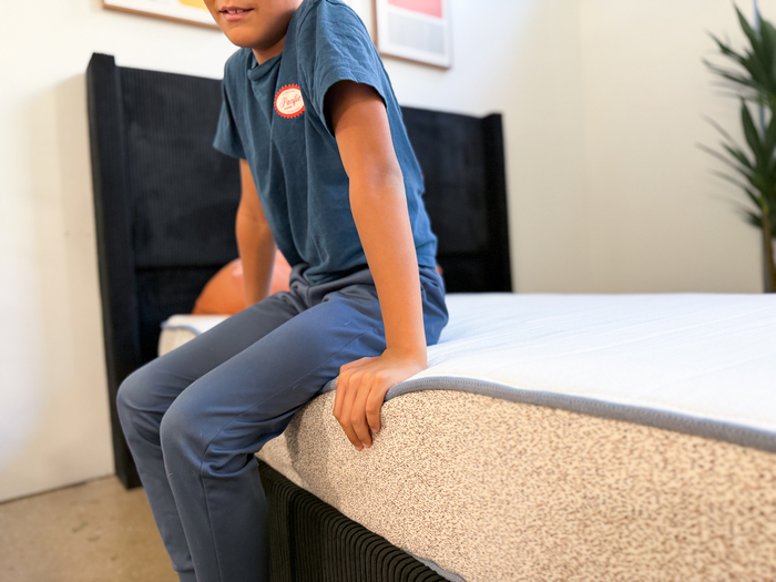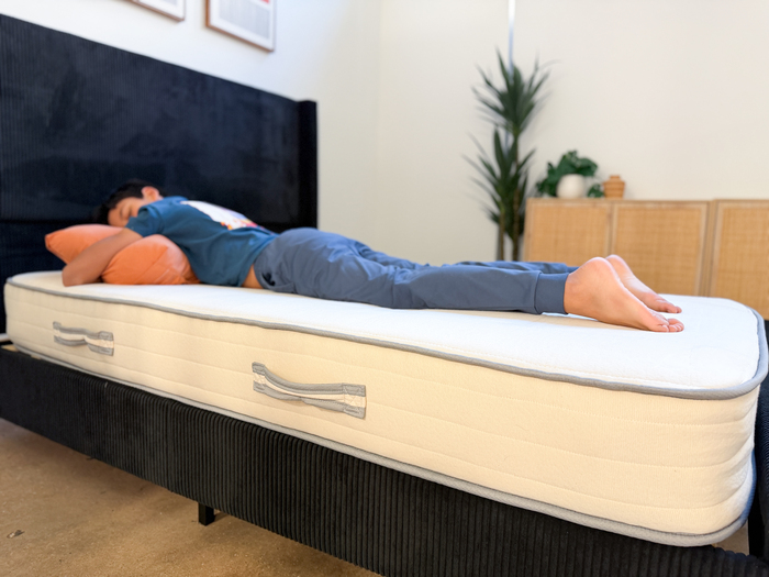 Our testers rated the eight and up side of the mattress at around a 6.5/10 on our firmness scale, which is medium-firm. “Not too firm but a little soft,” said our 10-year-old tester Conrad. Though Conrad preferred the mattress on his back, lightweight tester Riley Otis added that this mattress could be a good pick for side sleepers.