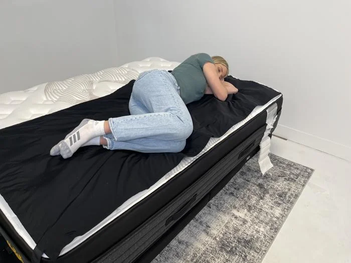 Our mattress testing team, made of various body types and sleep preferences, lies on each mattress in the back and side-sleeping positions and provides feedback on where they feel tension (if any) building up.