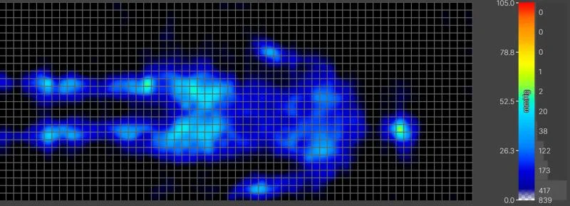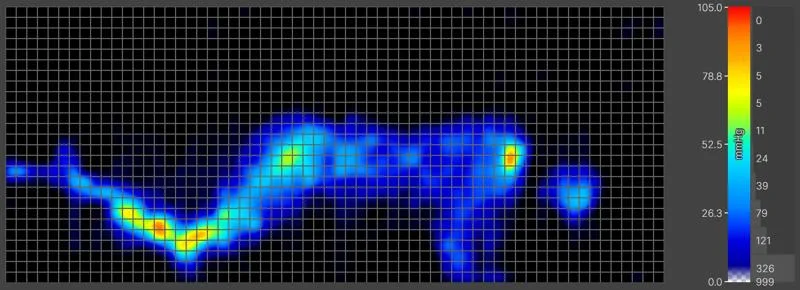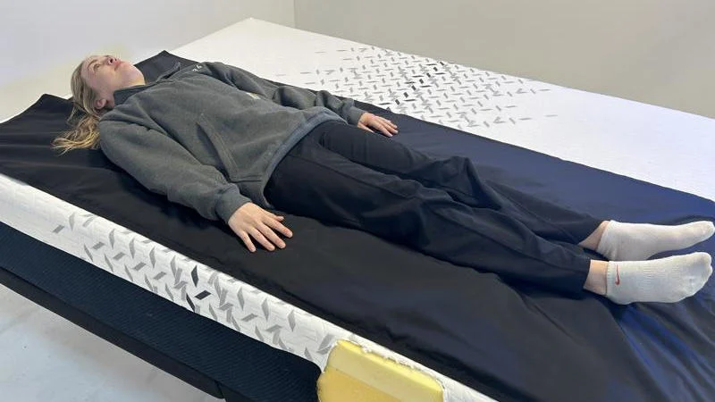 We also employ a pressure-reading mat placed directly on the mattress. We lie on the mat, and it captures a color-coded image of pressure buildup. Blue and green indicate low-pressure zones, while yellow and red show areas of elevated pressure buildup.