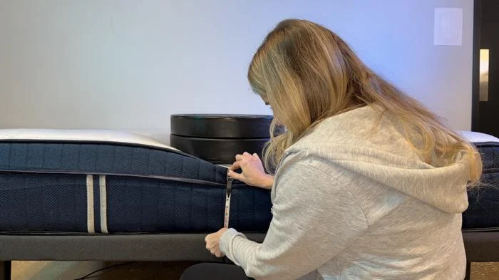 To evaluate edge support, our in-house testers sit, lie, and shift positions on the sides of each mattress to measure stability during movement. We also perform a weighted sinkage test by placing stacked weights (100, 145, and 200 pounds) near the edge to simulate compression for different body types. Finally, we use a tape measure to record the amount of sinkage under each load.