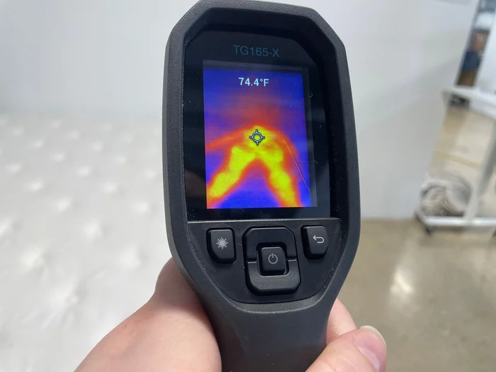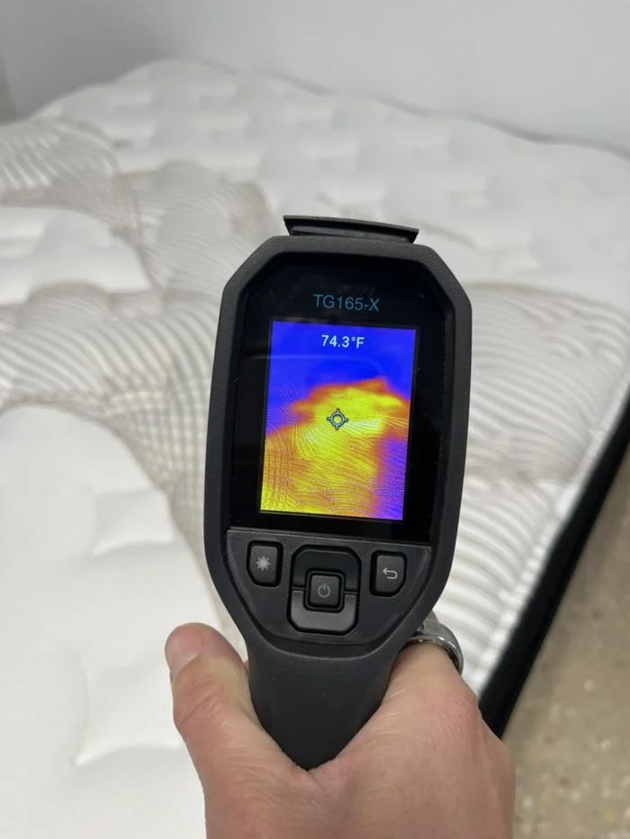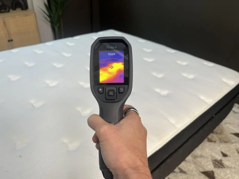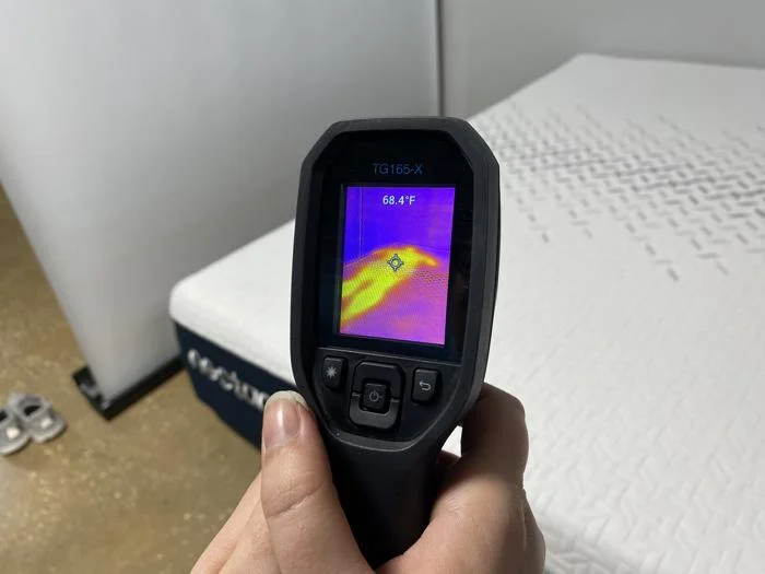 We test a bedโs cooling capability in two ways. Our temperature test uses a thermal gun to record the mattressโs surface temperature in two instances: before our tester lies on the mattress and again after about 7 minutes. The increase in temperature directly correlates with our cooling rating. On average, we see about a 5.8-degree increase, which weโd call good coolingโso anything lower is a sign of exceptional cooling.