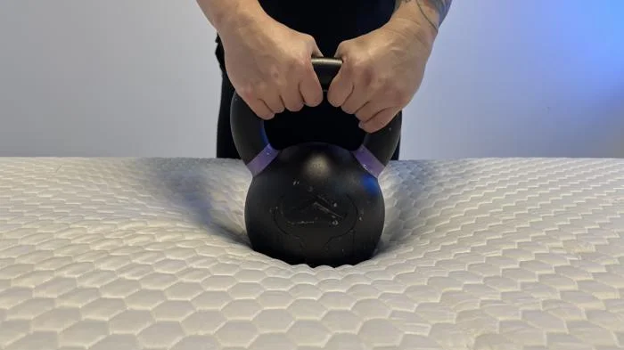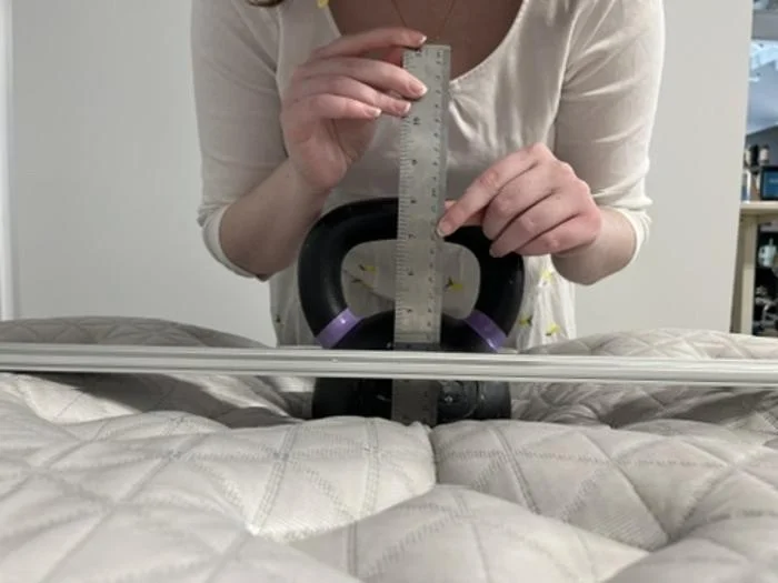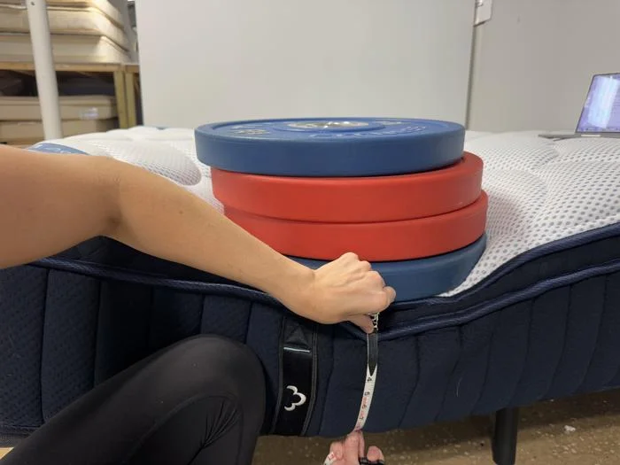 We test edge support by sitting and lying down at the edge of the bed, judging how secure we feel in each position and giving it a score out of 5. After this, we stack weight plates along the perimeter, increasing the weight to mimic sleepers of different sizes perching on the edge. We then use a tape measure to record the sinkage depth, which is rated out of 5. The final edge support rating is an average of these two.