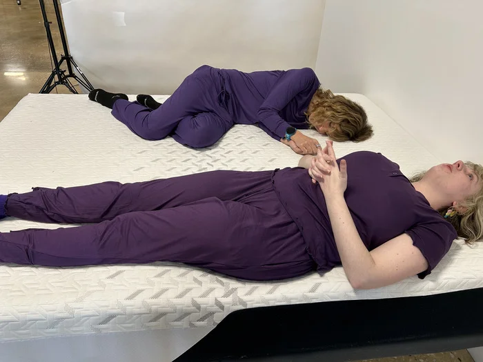 To test pressure relief, we employ the help of three testers, each representing a specific weight category. Each tester will lie on their back and side on top of the mattress. On their back, theyโre looking for pressure relief around the lumbar spine. On the side, the hips and shoulders should receive plenty of contouring.