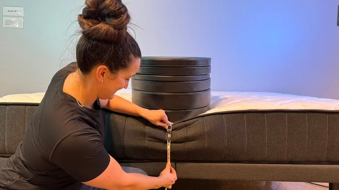 The support this mattress offers extends to the very edges, creating a sturdy perimeter that doesnโt dip or bend when bearing weight. I didnโt notice any difference between lying down and sitting at the very edge of the bed. It means this mattress should ensure it holds its shape as you maneuver it into its desired position on the base. However, I noticed more sinkage when tying my shoe at the foot of the bedโsomething to keep in mind for older adults who need a reliable edge.