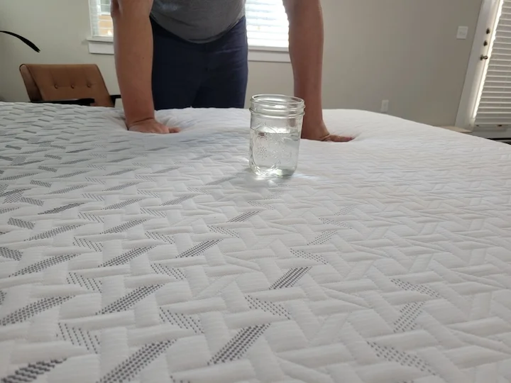 We test for motion transfer by placing a glass of water on one side of the bed and having a tester roll around and change positions on the opposite side. If the water doesnโt spill or stays still, it is usually a good indicator that the mattress will limit disturbances from movement.
