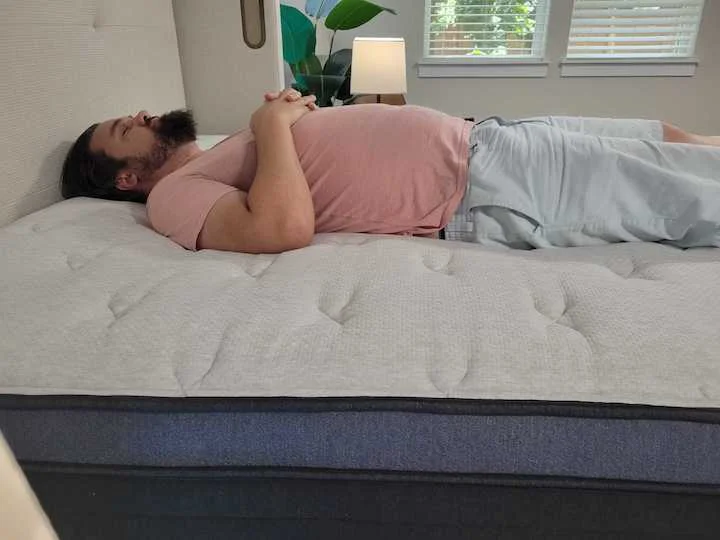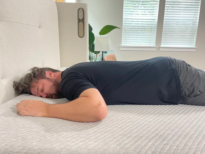 According to Dr. Hannah Habeeb (DPT), our Chief Medical Product Tester, โthe bed keeps your spine aligned [while stomach sleeping] and helps lift the hips.โ It kept her spine neutral in this position and she didnโt feel pain anywhere, though she cautioned folks that the mattress is indeed very firm, and wonโt be comfortable for everyone. Our heavyweight tester, Matt Schickling, echoed her assessment: โThis would be fine if youโre a heavy back sleeper if you like firm mattresses, but itโs still a little firm for my taste.โ
