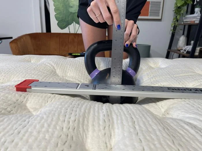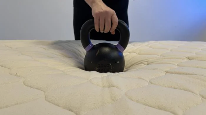 When evaluating edge support, our testers sit and lie along the sides of the mattress to assess stability and compression. We also place three stacks of weights on the edge to simulate the pressure from lightweight, average-weight, and heavyweight sleepers. This method helps us measure how well each mattress maintains its structure under different types of load.