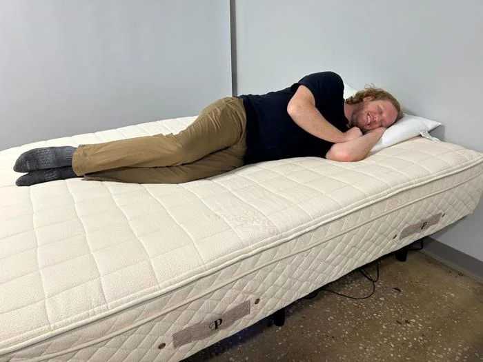 โThis feels really nice on my lower back,โ he said. โIt has the bouncy latex feel, but itโs a little more mellow than most latex beds. My shoulders feel spread out and supported.โ