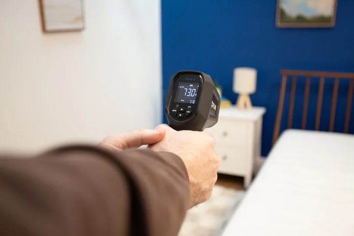 How do you tell if a bed is cooling? Well, in our studio, we get technical. We use a thermal gun to measure the temperature at the surface of the mattress in two instances: first, before anyone hops in, and second, after a tester has lay down on it for about seven minutes. The recorded increase in temperature shows us how much heat the bed holds onto. On average, we see increases of about 7.1 degrees, which would earn about a 4/5 temperature regulation score.
