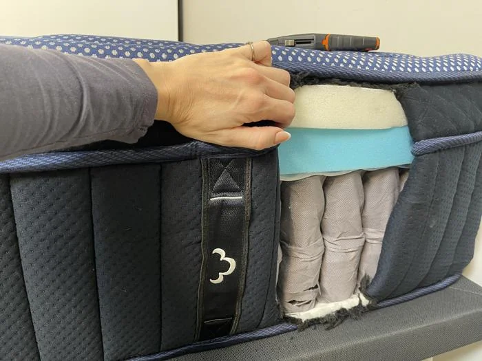 After this, we have another tester join us on the mattress for our second test. One of us will lie down blindfolded while the other moves around on the other side. We raise our hand and comment if we can feel their movement, as well as whether or not we can describe what theyโre doing. We take the results from these tests to give our final motion isolation score out of 5, which is a marker if the mattress is good for couples.