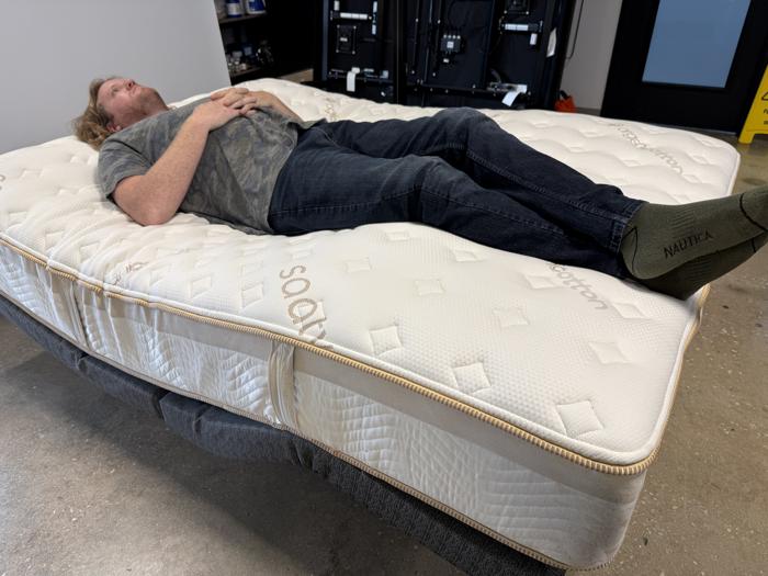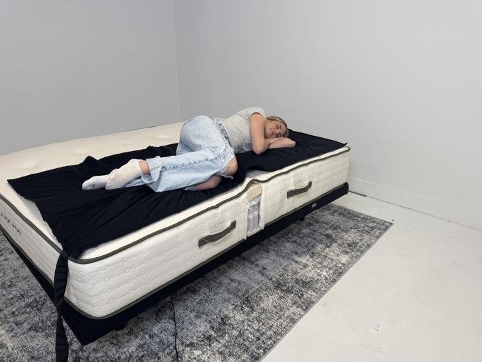 The next test is similar, but we swap the water for another tester. While one tester lies down blindfolded, the other tester moves around, switching positions, getting out of bed, etc. The blindfolded tester raises their hand whenever they feel movement. Each of these tests involves a rating out of 5, and we average the results of both to get a total overall motion isolation score.