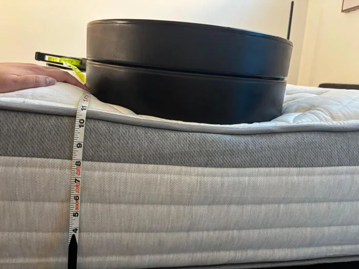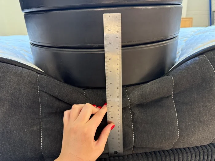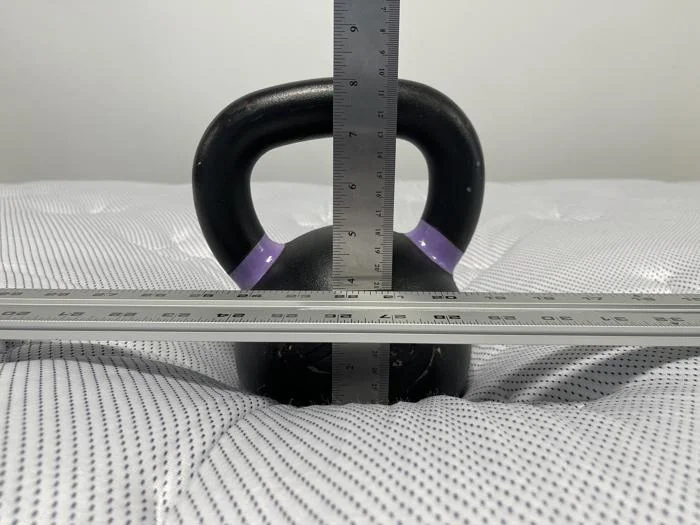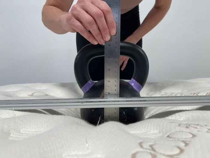 During testing, our in-house team sits, lies, and shifts positions along the border of each mattress to gauge stability during movement. Our mattress testers also conduct a weighted sinkage test by placing stacked weights (100, 145, and 200 pounds) near the edge to simulate compression for different body types. Using a tape measure, we record the amount of sinkage under each load.