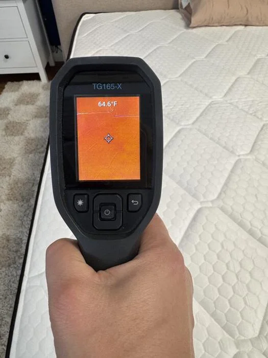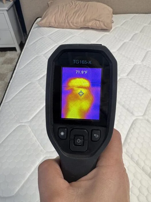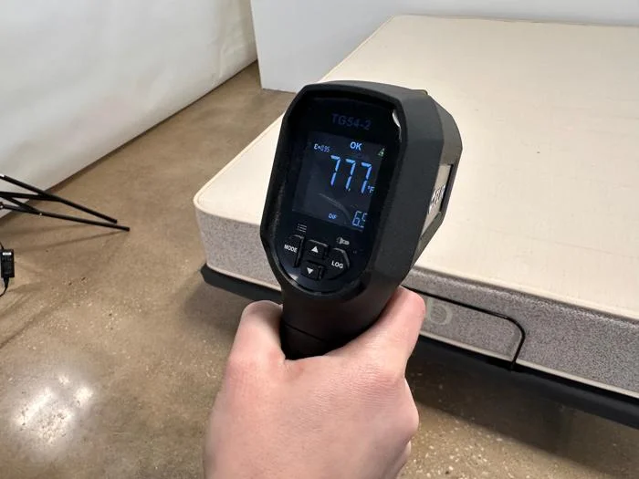 To measure cooling performance, we used a thermal gun to measure and record the amount of heat each mattress retains after lying on it for 7 uninterrupted minutes.