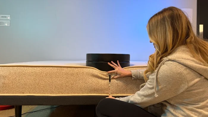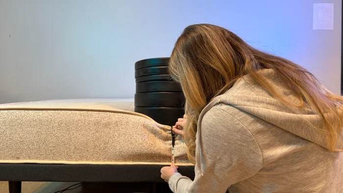 To test sinkage, our tester Sosha Lewis placed a 44-pound kettlebell on the bed and used a ruler to see how far it sank. It’s a useful indicator of how much compression sleepers can expect when lying down. Deeper sinkage is more common with softer, more contouring foams, and it’s characterized by a notable “hugged” sensation. Less sinkage means a more lifted, buoyant feeling.