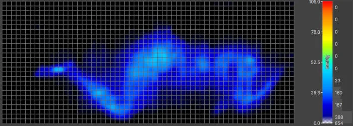 We test pressure relief using a specialized mat placed on the mattress. When our testers lie down, the mat generates a color-coded map that highlights areas of high and low pressure. Blue and green indicate low pressure, while yellow and red mean high pressure. The mat also gives us an average pressure score based on the entire surface of the mattress, which gives us a clue into the overall strain on the body.