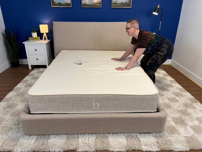 Nicole began our motion isolation tests by placing a glass of water on one side of the bed. On the other side, she got on and off the mattress, paying close attention to how her activities affected the water in the glass. It barely moved at all, earning a perfect score.