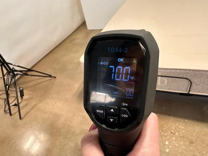 Since it’s an eco-friendly mattress, there are no synthetic cooling fibers in this cover. The Birch Natural has an organic cotton cover that’s soft to the touch. Nicole used a thermal gun to measure the bed’s surface temperature before she began our tests, which read 70 degrees. After resting on it for roughly seven minutes, she measured the bed’s temperature a second time. It increased to 77.7 degrees, which qualifies as good temperature regulation.