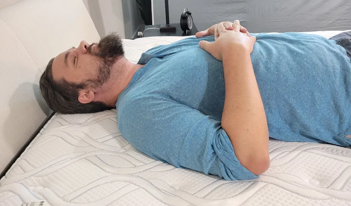 Moving to my side, I felt a bit of pressure on my shoulders and hips. Side sleepers usually require something on the softer end, and the Brooklyn Essential is too firm for me. However, I weigh 270 lb, so I may be pushing further into the mattress than a lighter person might. If you weigh less than me, the Brooklyn Essential might feel softer to you than it did to me.
