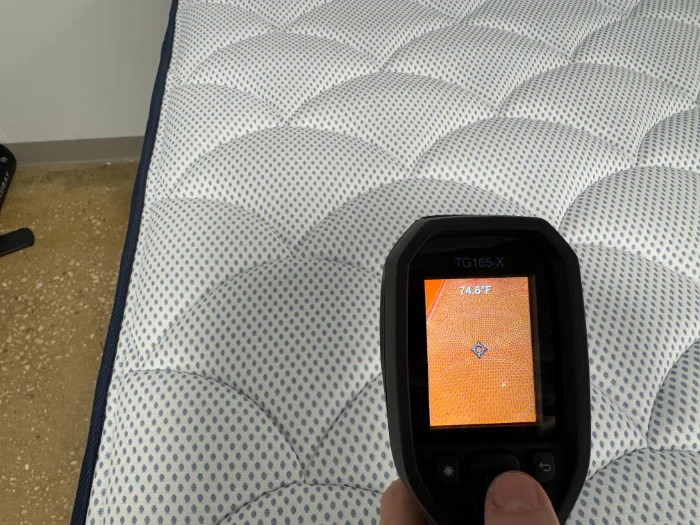 Using a thermal gun, tester Kayla Godfrey measured the surface temperature of the mattress before lying on it for 7 minutes and measuring it again. She found that the temperature increased 9.6 degrees from 74.6 to 84.2. While she didnโt find its cooling features particularly impressive, she also didnโt feel uncomfortably warm. โI did feel the mattress warm up slightly, but nothing of major concern. I felt like the mattress is great overall and wouldnโt have me waking up from being too hot.โ