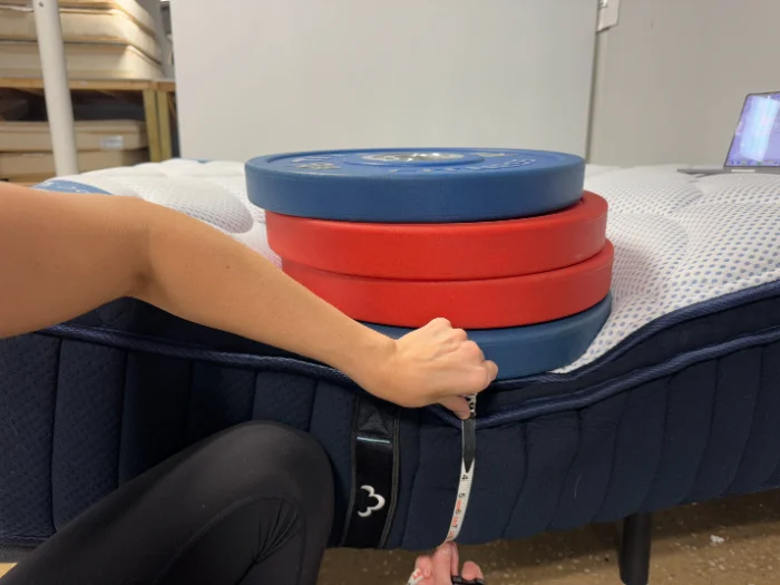 Kayla and other testers sat and laid on the edges and corners of the DreamCloud Premier to understand how it might perform for different sleepers. They also placed weights right along the perimeter of the bed to gauge just how much the edges would sink.