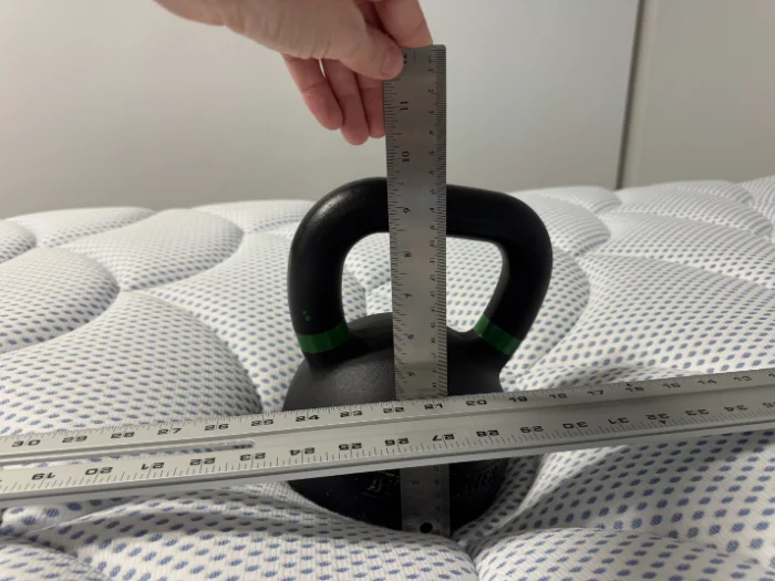 The kettlebell also helps us measure how far the bed sinks under a sleeperโs body weight. Our testers assess this by measuring how deeply the mattress sinks when the kettlebell is on it. The DreamCloud Premier sank 4.25 inches, which is slightly more than average. Given how cushioned our testers felt on this bed, this result makes sense.