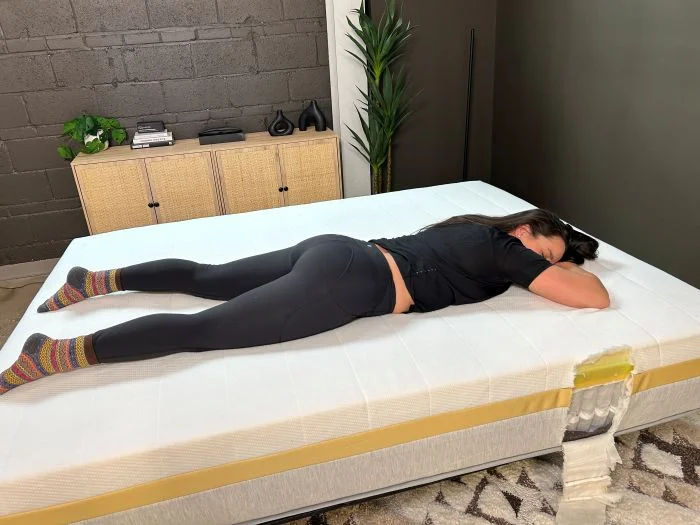 Kate had high hopes for the Helix mattress when she flipped to her stomach. โI thought this was going to be great for sleeping on my stomach, but it doesnโt feel as firm and supportive in my hips as I would have liked it to be,โ she reported. โI could feel my hips sink too much when I was on my stomach, which created a strain in my lower back and poor spinal alignment. I wouldnโt recommend this for stomach sleepers.โ She gave the Dawn a firmness score of 6.5/10 in this position.
