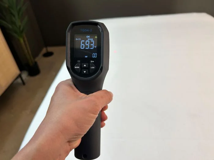 Kate Meier used a temperature gun to take an initial read of the Helix Dawn. Then she lay on it for seven minutes and tested it a second time. The mattress increased in temperature from 69.3 degrees to 78.6 degrees. The 9.3-degree change isnโt great, earning the bed a score of 3.5/5 stars.