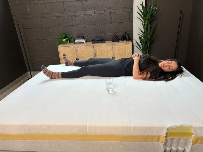 For the third test, another tester replaced the glass of water. Kate stayed on her side, eyes covered, and assessed the level of disturbance as her partner climbed in and out of bed and rolled around on the comfort layer. โYou can feel a lot of motion transfer and just about every movement your partner makes on this bed,โ she said. โSome movements, like getting in the bed, were more noticeable and caused more disruption than others. If youโre a light sleeper with a partner, youโll probably wake up.โ