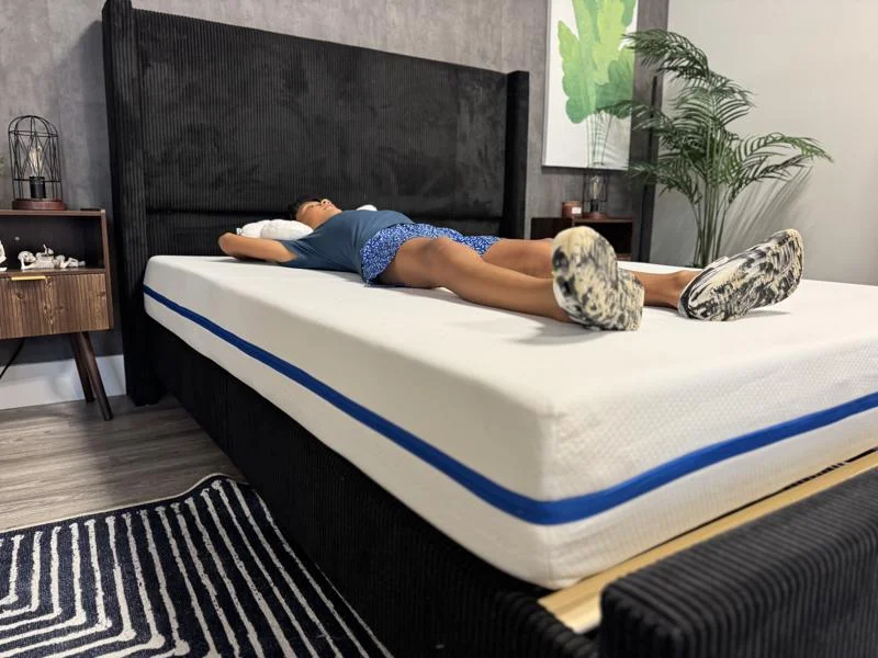 We evaluate edge support using two objective tests. Starting with the 8 & Up side, I first sat directly on the edge of the bed with my feet on the floor. While the top layer of memory foam slightly compressed, I remained lifted and secure. I gave it a 4.5 for its seated edge support. Then, I lay directly on the edge in each sleeping position. No matter how close to the edge I was, I felt even support across the entire bed, so I rated the edge support while lying down 5 stars.
