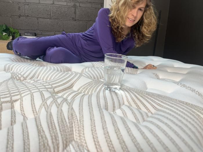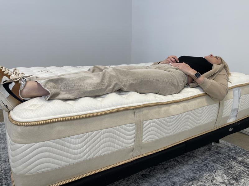 “This mattress feels great,” Livvi said. “My favorite part about this mattress is that it fills in your lower back. The quilted top is plush, but the pocketed coils underneath offer great support for my back. I do like this mattress for this position, but I am typically a side and stomach sleeper. I can also see this working for lots of combination sleepers.”
