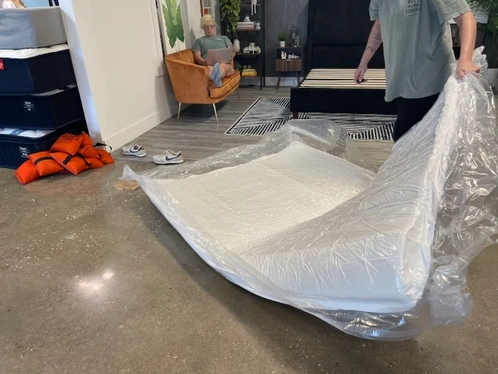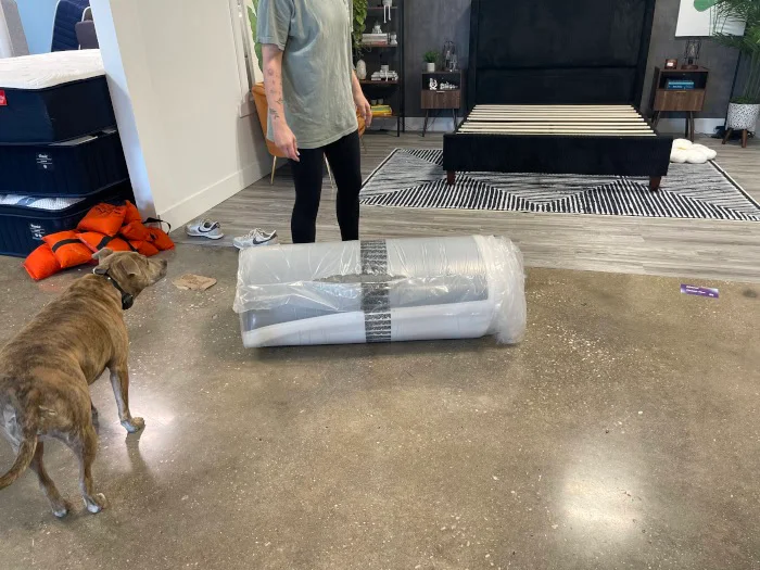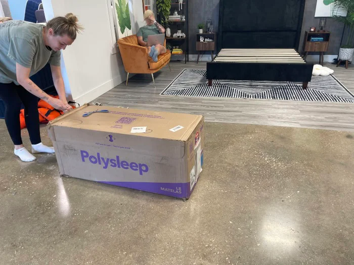The Polysleep Sierra mattress will arrive at your door compressed in a box, just as it did in our studio. Our in-house tester was able to unbox the mattress on her own, only encountering some initial resistance from the first plastic layer. โI had no problem moving the box around and lifting the mattress onto the bed frame,โ she said. She rated the unboxing and moving experience at a 5/5.